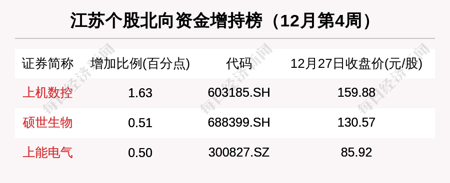 再看北向资金,12月第4周,上机数控北向资金持股比例增加1.63个百分点,硕世生物北向资金持股比例增加0.51个百分点,上能电气北向资金持股比例增加0.50个百分点。