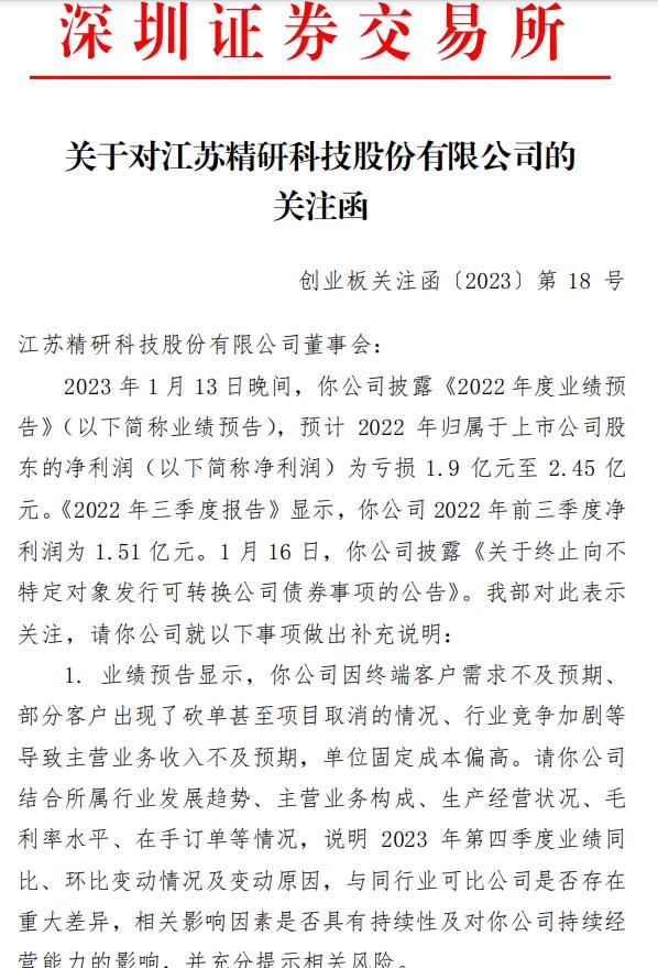 关注函显示,2023年1月13日晚间,精研科技披露《2022年度业绩预告》(下称业绩预告),预计2022年归属于上市公司股东的净利润(下称净利润)为亏损1.9亿元至2.45亿元。《2022 年三季度报告》显示,公司2022年前三季度净利润为1.51亿元。