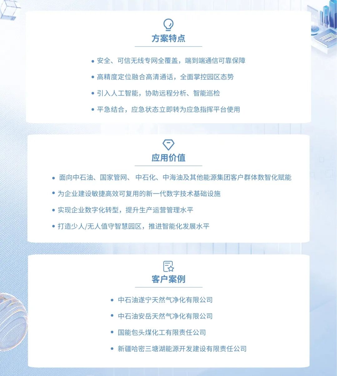 “灵犀”5G数字化安全管控平台,深度融合5G核心网、高精度定位、融合通信及人工智能等前沿技术,为企业提供5G安全专网、应急指挥调度、园区全域可视、远程智能巡检和作业全程管控等智能应用。实现片区全域可视、可管、可控,全面实现对各类生产环境的智能化、数字化管控,提升安全生产水平。