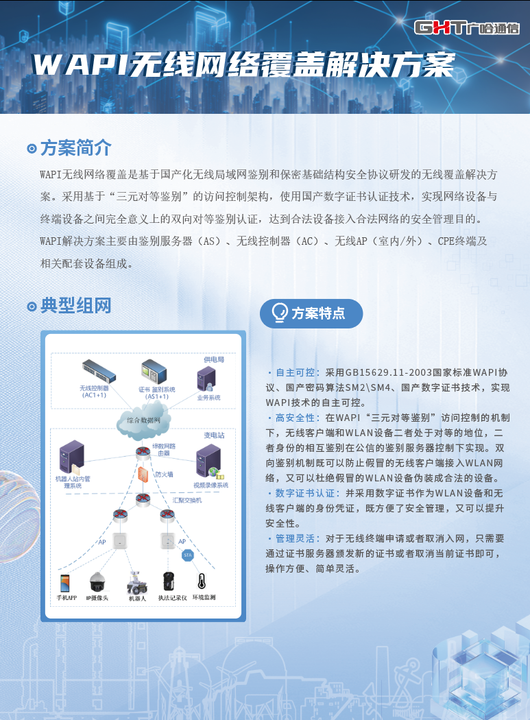 WAPI无线网络覆盖是基于国产化无线局域网鉴别和保密基础结构安全协议研发的无线覆盖解决方案。采用基于“三元对等鉴别”的访问控制架构,使用国产数字证书认证技术,实现网络设备与终端设备之间完全意义上的双向对等鉴别认证,达到合法设备接入合法网络的安全管理目的。WAPI解决方案主要由鉴别服务器(AS)、无线控制器(AC)、无线AP(室内/外)、CPE终端及相关配套设备组成。