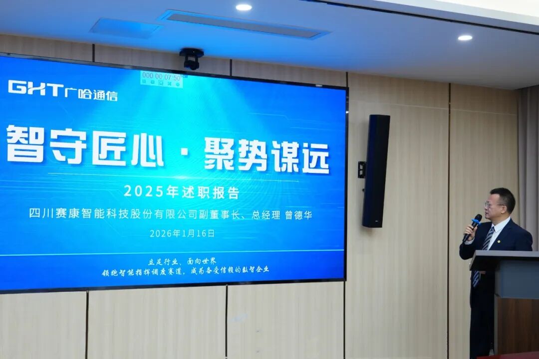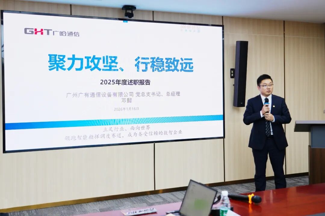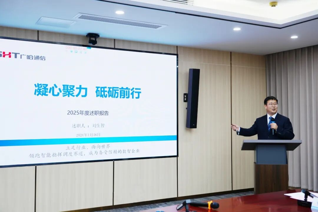 1月16日,广哈通信组织召开2025年度下属公司企业领导班子述职考评会。公司党委书记、董事长孙业全,党委副书记、总经理王勇等领导班子成员,总经理助理、各部门负责人、各子公司领导班子等34人齐聚一堂,全面回顾2025年经营成果,共同展望2026年发展蓝图。