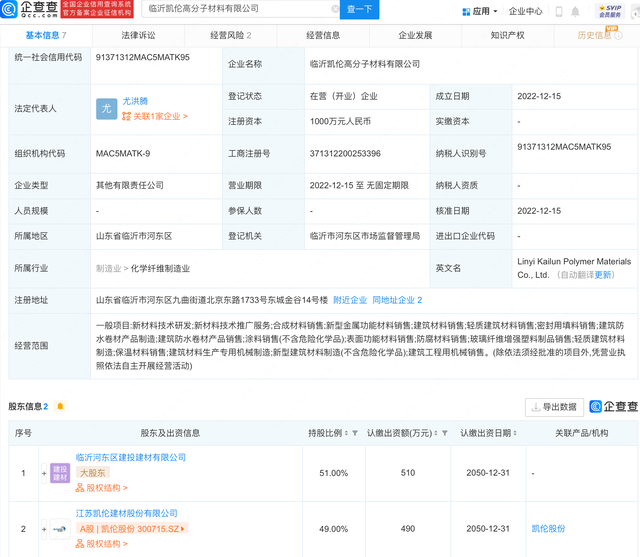 近日,临沂凯伦高分子材料有限公司成立,法定代表人为尤洪腾,注册资本1000万元。企业经营范围包括新材料技术研发;新材料技术推广服务;合成材料销售;新型金属功能材料销售等。股东信息显示,该企业由临沂河东区建投建材有限公司、江苏凯伦建材股份有限公司分别持股51%、49%。