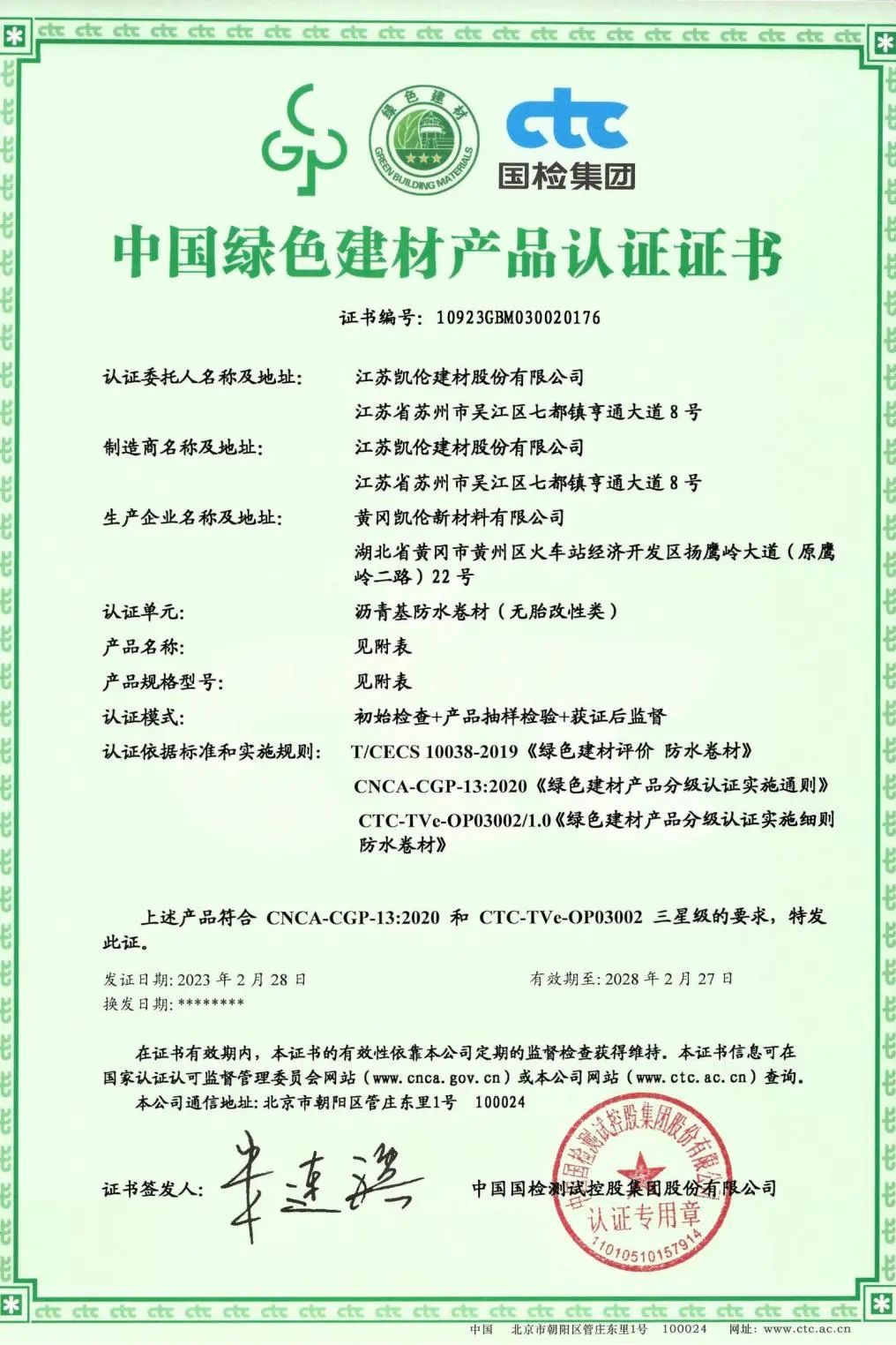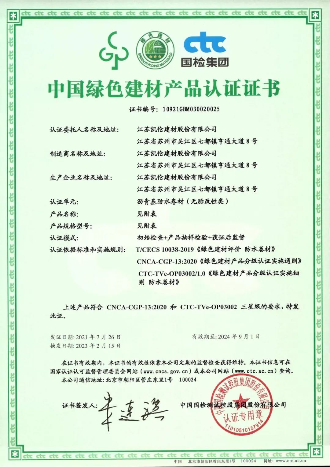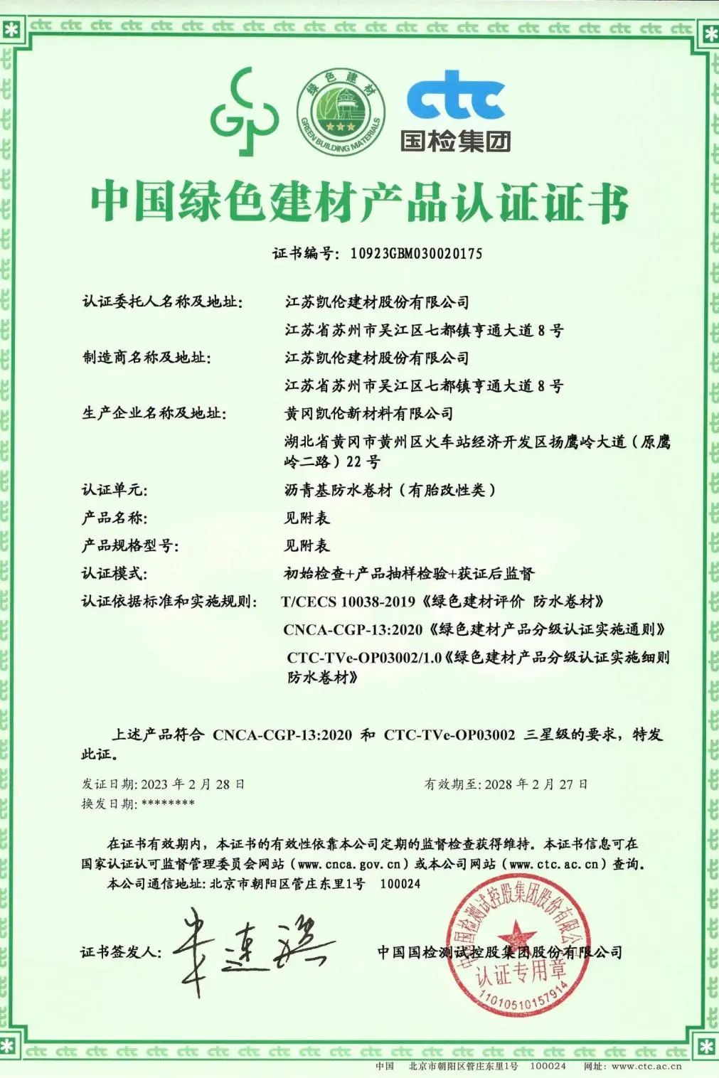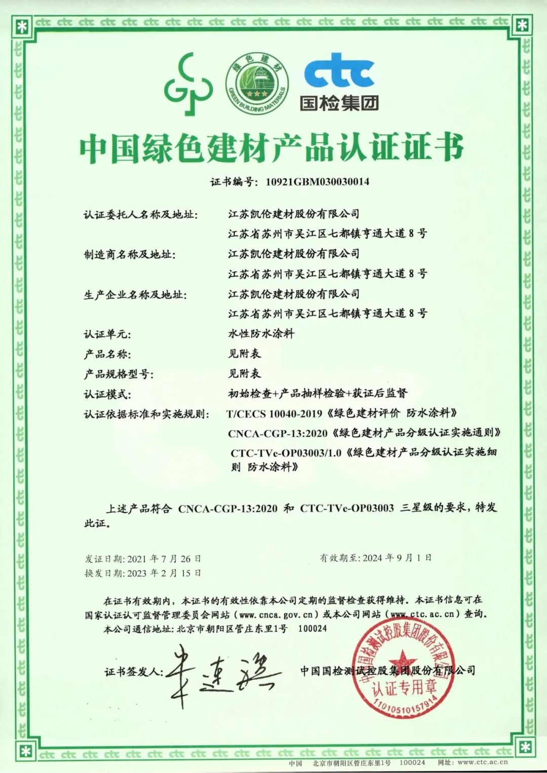 近日,凯伦股份苏州生产基地、黄冈生产基地多款产品获得由国检集团认证并签发的《中国绿色建材产品认证证书》。