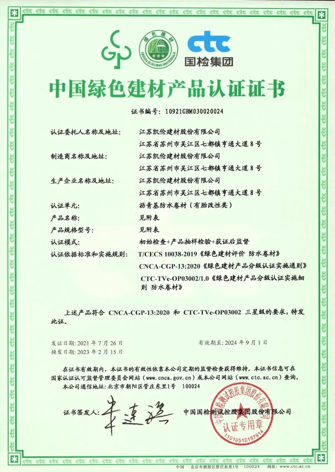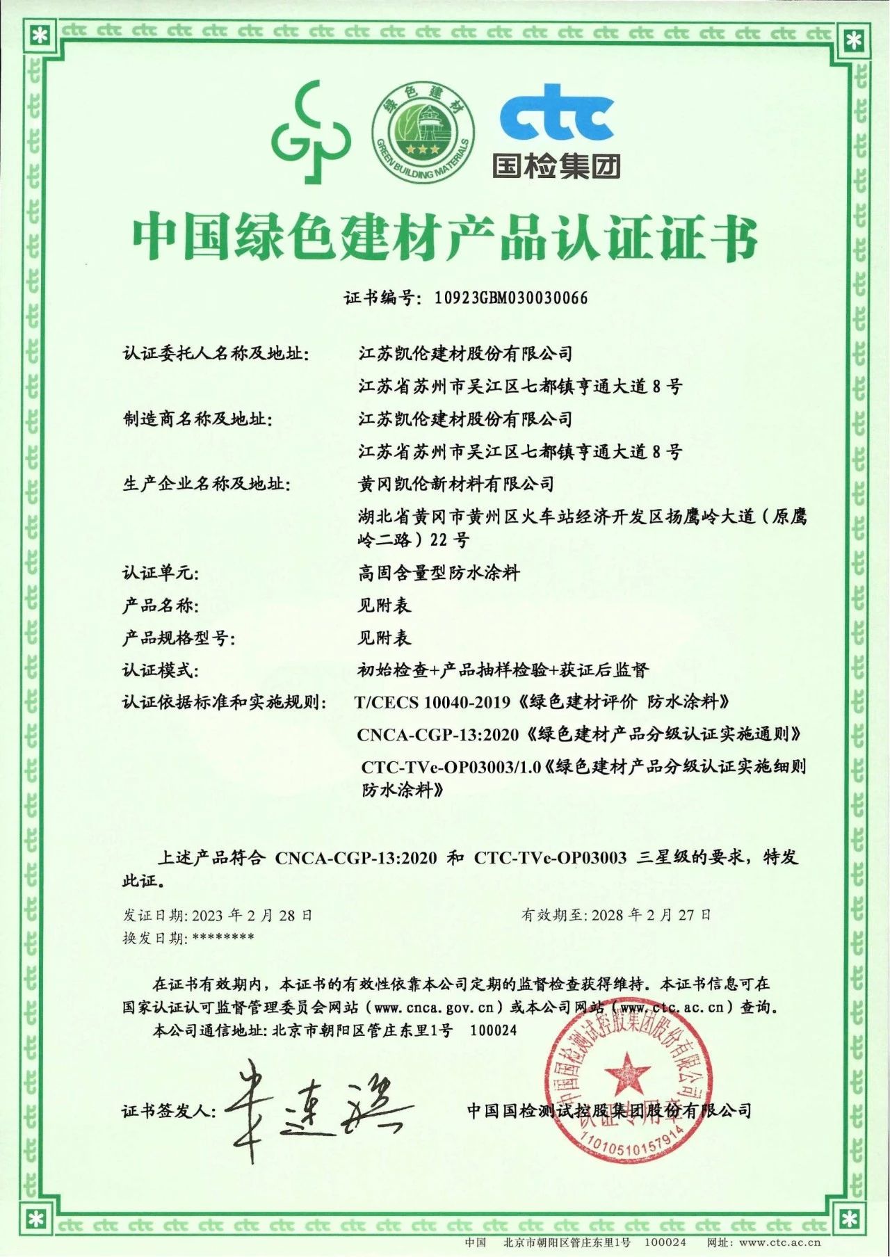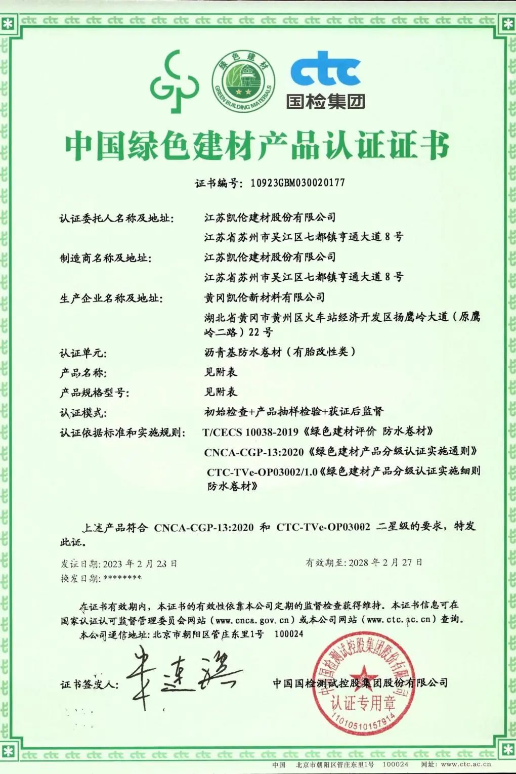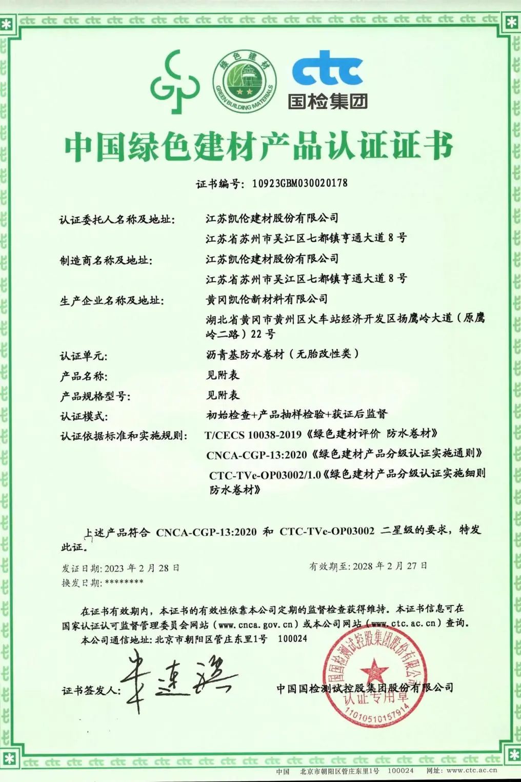 近日,凯伦股份苏州生产基地、黄冈生产基地多款产品获得由国检集团认证并签发的《中国绿色建材产品认证证书》。
