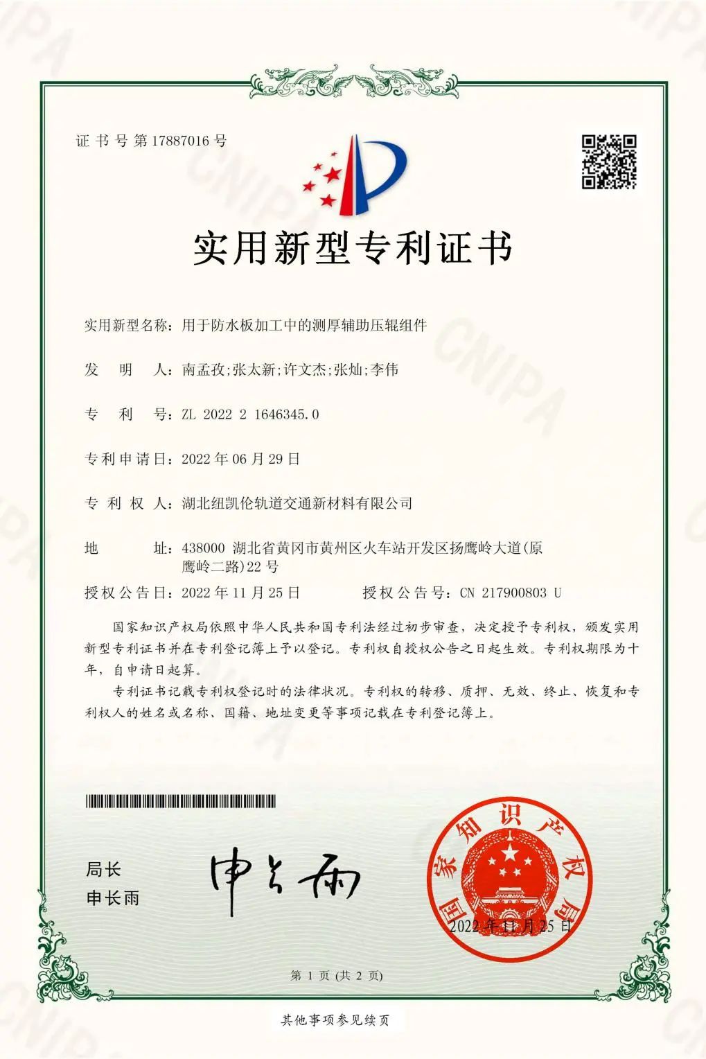 此外,湖北纽凯伦轨道交通新材料有限公司也于近期取得了由国家知识产权局授予的5项实用新型专利证书。分别为:一种基于防排水板加工的配料罐设备;一种具备刮胶功能的防水板生产用制胶罐;用于防水板加工中的测厚辅助压辊组件;一种可调式防水板生产中的暂存架系统;一种防排水板加工冷却定型系统。