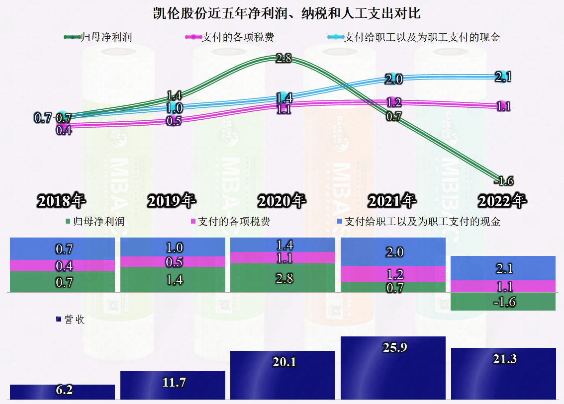 上市后这五年,凯伦股份的营收增长了两倍多,税收的增长基本与营收同步,薪酬类的增长略高一些,只有净利润的增长,在2020年爆发后,就出现了异常下跌。