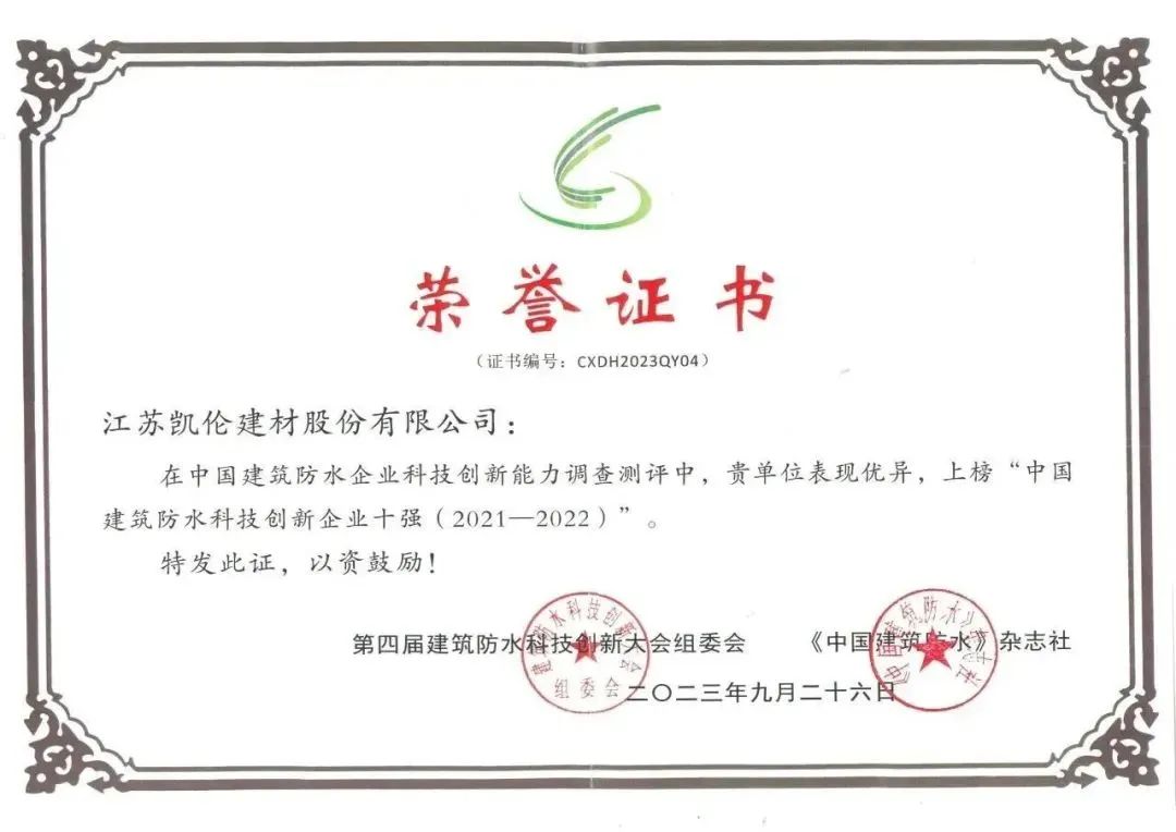 第四届建筑防水科技创新大会科成功召开,揭晓了多个行业榜单。测评从企业综合实力、科技投入、科技人员、科技项目与成果、科技知识产权、绿色与智能等维度,对企业营业收入、净利润、科研总投入、研发投入强度、科研人员数量与强度、高级科研人才占比、科创平台、科创项目、科创成果、科创资金、发明与实用新型专利、科技著作、学术论文等指标进行量化权重。其中,凯伦股份凭借自主创新研发实力,成功入选“中国建筑防水科技创新企业十强”榜单(排名第4位)。