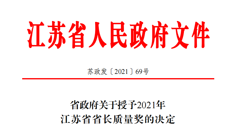 江苏省省长质量奖是省政府设立的质量领域最高奖项,授予实施卓越绩效管理、取得显著经济效益和社会效益的企事业单位以及质量工作成绩显著、对江苏经济社会发展做出卓越贡献的个人。