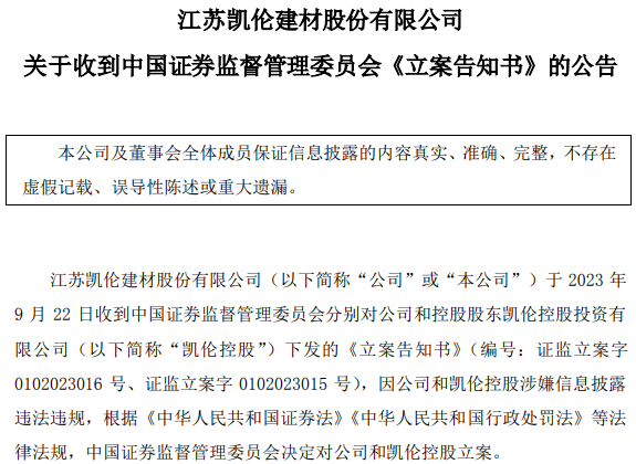 9月22日,凯伦股份公告,收到证监会分别对公司和控股股东凯伦控股下发的《立案告知书》,因公司和凯伦控股涉嫌信息披露违法违规,证监会决定对公司和凯伦控股立案。