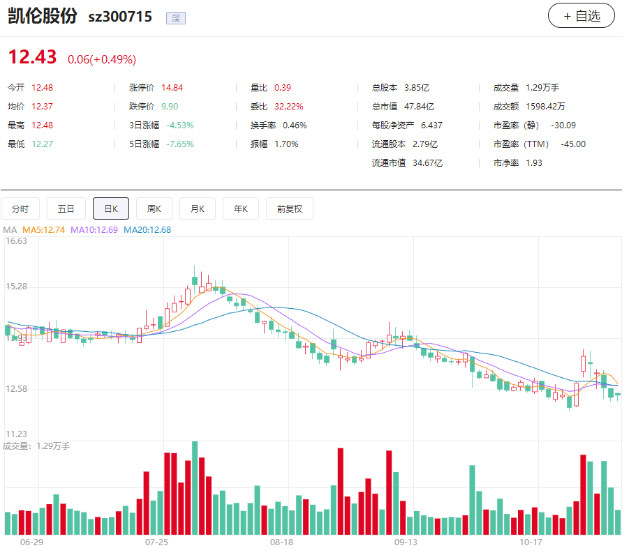 在二级市场上,截至11月1日收盘,凯伦股份股价12.43元/股,总市值47.84亿元。