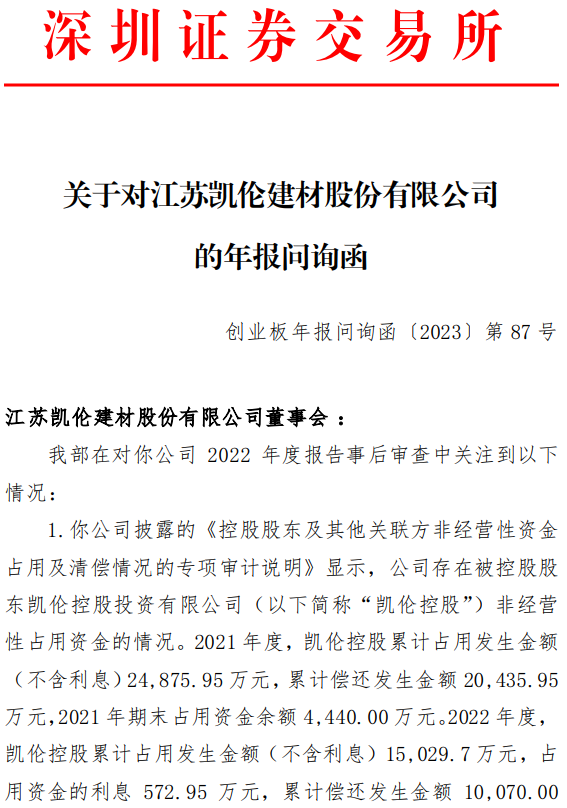 根据深交所10月31日的通报,凯伦股份于2023年4月28日、5月19日披露的《控股股东及其他关联方非经营性资金占用及清偿情况的专项审计说明》《关于深圳证券交易所2022年年报问询函的回复公告》显示,凯伦股份存在被控股股东凯伦控股投资有限公司(以下简称凯伦控股)非经营性占用资金的情况。2021年3月至2023年4月,凯伦控股累计占用发生金额(不含利息)48701.65万元,其中,2021年度日最高占用余额16450万元,2022年度日最高占用余额15399.70万元,2023年度日最高占用余额18195.70万元。截至2022年年报披露日,凯伦股份已收回全部资金及利息。
