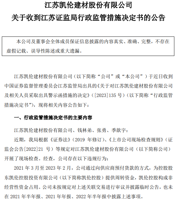 9月8日,凯伦股份发布公告,公司于近日收到江苏证监局警示函,经查,公司存在以下违规行为:2021年3月至2023年2月,公司通过向供应商预付货款的方式,为控股股东凯伦控股投资有限公司提供周转资金,凯伦控股构成非经营性资金占用。公司未按规定对上述关联交易进行审议并披露临时公告,也未在2021年半年报、2021年年报、2022年半年报中披露上述事项。