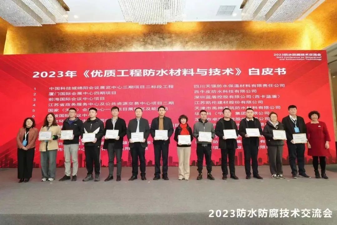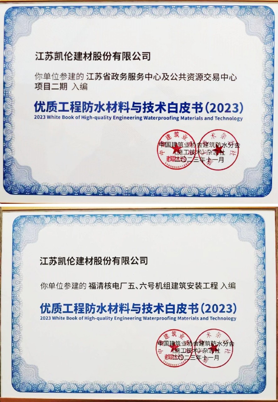 会上隆重公布了《优质工程防水材料与技术白皮书(2023)》,凯伦股份参建的江苏省政府服务中心及公共资源交易中心项目二期、福清核电厂五六号机组建筑安装工程光荣入编。