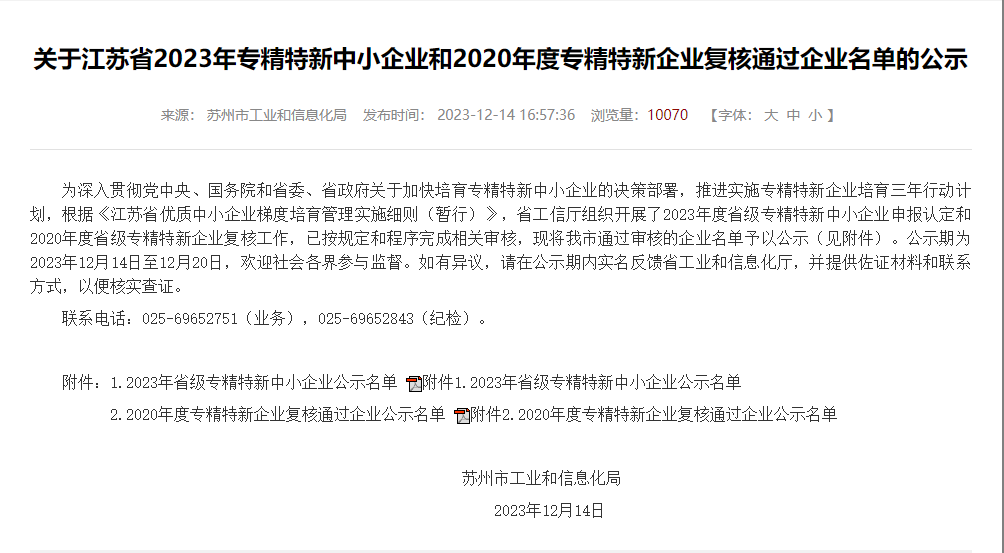 近日,苏州市工业和信息化局发布《关于江苏省2023年专精特新中小企业和2020年度专精特新企业复核通过企业名单的公示》。江苏凯伦建材股份有限公司顺利通过2020年度专精特新企业复核。