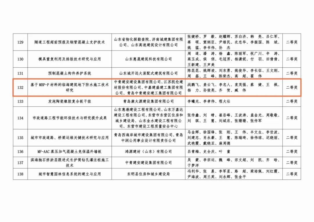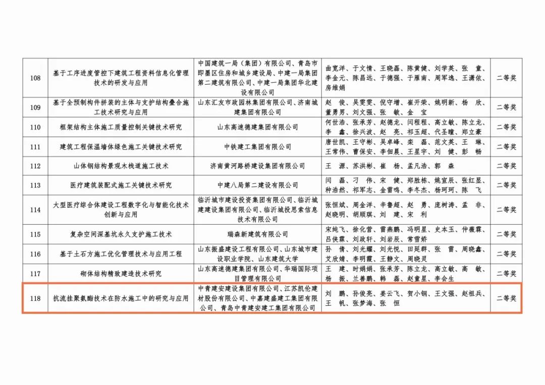 日前,山东省住房和城乡建设厅通报了2023年度山东省建设科技创新成果竞赛优胜成果,凯伦股份的“基于MBP-P材料的临海建筑地下防水施工技术研究”和“抗流挂聚氨酯技术在防水施工中的研究与应用”两项创新成果获得二等奖。