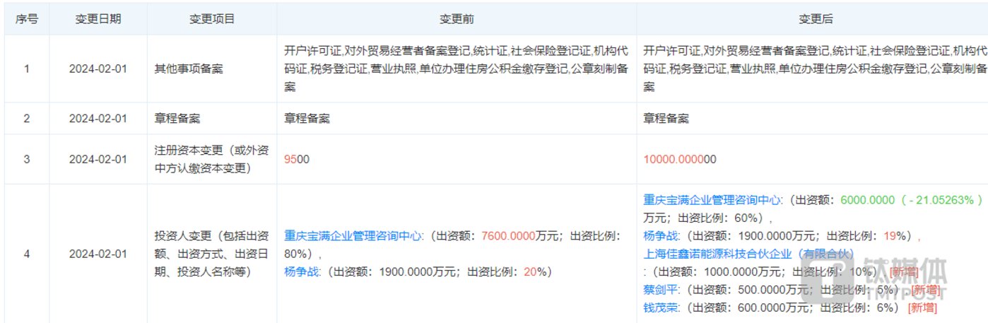 本次交易前,点金石科技股东数量为5名,分别为重庆宝满、杨争战、上海佳鑫诺能源科技合伙企业(有限合伙)(以下简称“上海佳鑫诺”)、钱茂荣以及蔡剑平。其中,重庆宝满持股60%,系第一大股东。股权穿透显示,上海佳鑫诺由况富意、杨争战担任有限合伙人,分别持股33%、10%。