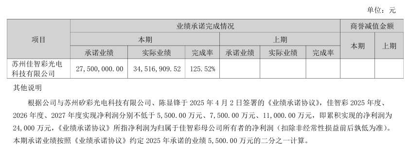 佳智彩主要从事新型显示面板补偿修复业务,收购完成后,佳智彩实现净利润3,472.06万元,占公司报告期内实现净利润总额的81.96%。上半年,该业务实现营收1.16亿元,毛利率达45.35%,显著高于凯伦股份传统业务的毛利率。依据报告,本期佳智彩承诺业绩为2750万元,实际业绩为3452万元,完成率高达125.52%。