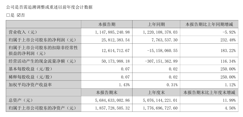 8月26日,凯伦股份(300715.SZ)披露2025年半年度报告。上半年,公司实现营业总收入11.48亿元,同比下降5.92%;归母净利润2581.24万元,同比增长232.48%;扣非净利润1261.47万元,同比扭亏;经营活动产生的现金流量净额为5017.4万元,上年同期为-3.07亿元。报告期内,基本每股收益0.07元,加权平均净资产收益率为1.43%。