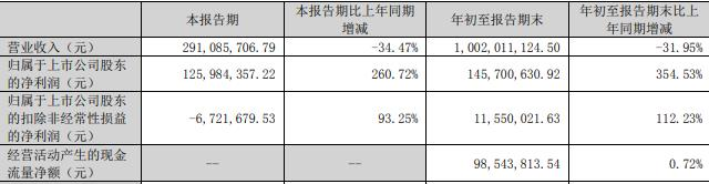去年前三季度,公司实现营业收入10.02亿元,同比减少31.95%;实现归属于上市公司股东的净利润1.46亿元,同比增长354.53%;实现归属于上市公司股东的扣除非经常性损益的净利润1155.00万元,同比增长112.23%;经营活动产生的现金流量净额为9854.38万元,同比增长0.72%。