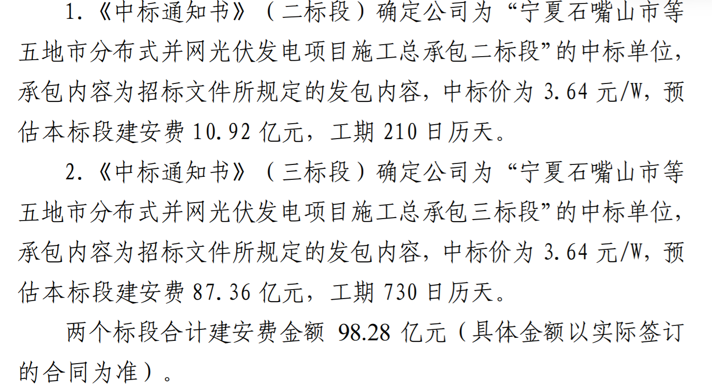 3月1日,粤水电再度公告称,中南粤水电正式中标五地市光伏项目施工总承包二标段和三标段,两个标段合计建安费金额98.28亿元。“上述工程正式合同尚未签订,合同条款尚存在不确定性。”粤水电当时称。