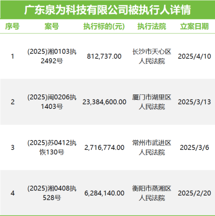 然而,好景不长。进入2025年,泉为科技深陷债务与诉讼泥潭。公开信息显示,仅半年内,其运营主体广东泉为科技有限公司已被法院列为被执行人4次,累计被执行金额高达3320万元。同时,公司涉及的被告案件数量激增至30起,相关争议金额约1230万元。