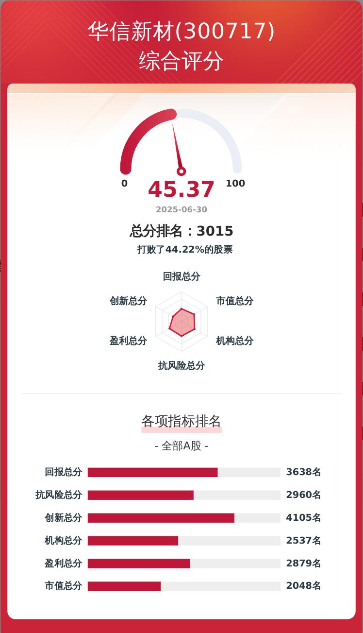 上市公司研究院构建了一套上市公司韧性评价体系,从企业盈利、科技创新、股东回报、经营抗风险、市值表现及机构吸引力六个维度对企业进行量化评分,满分为100分。华信新材的韧性评价总分为45.37分,在A股5405家可比上市公司中排名第3015位。