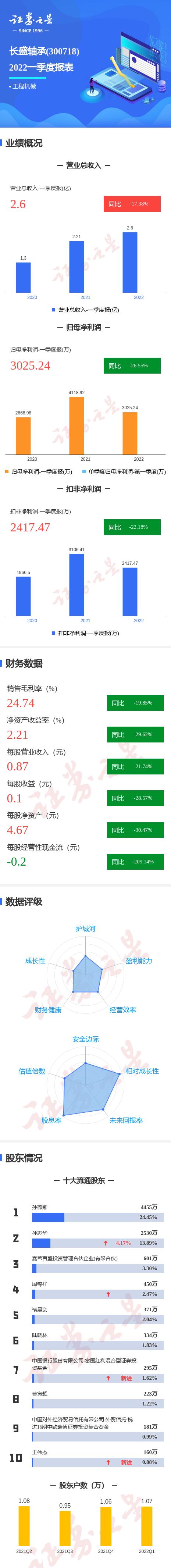 长盛轴承2022一季报显示,公司主营收入2.6亿元,同比上升17.38%;归母净利润3025.24万元,同比下降26.55%;扣非净利润2417.47万元,同比下降22.18%;其中2022年第一季度,公司单季度主营收入2.6亿元,同比上升17.38%;单季度归母净利润3025.24万元,同比下降26.55%;单季度扣非净利润2417.47万元,同比下降22.18%;负债率13.21%,投资收益421.75万元,财务费用278.31万元,毛利率24.74%。