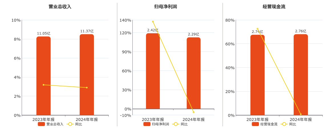 公司营业总收入为11.37亿元。归母净利润为2.29亿元,较去年同报告期归母净利润减少1314.35万元,同比较去年同期下降5.43%。经营活动现金净流入为2.76亿元。