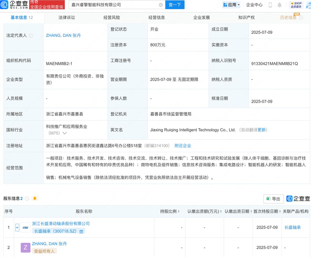 近日,嘉兴睿擎智能科技有限公司成立,法定代表人为ZHANG, DAN 张丹,经营范围包含:集成电路设计;智能机器人的研发;智能机器人销售;机械电气设备销售等。股权穿透显示,该公司由长盛轴承(300718)等共同持股。