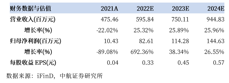 基于以上观点,我们预计公司2022-2024年的营业收入分别为5.96亿元、7.50亿元和9.45亿元,归母净利润分别为0.83亿元、1.14亿元及1.45亿元,EPS分别为0.33元、0.45元、0.57元,我们给予“买入”评级。