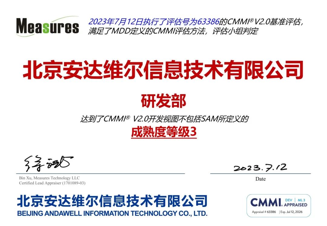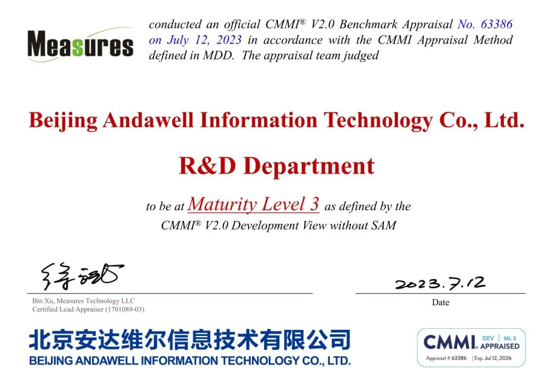 北京安达维尔信息技术有限公司于2022年10月正式启动CMMI3级评估项目,经过现状分析、制定改进计划、体系运行、评估能力四个完整步骤,于2023年7月3日至12日进行了为期8天的严格现场审核与评估。同年7月28日CMMI研究院正式审核通过北京安达维尔信息技术有限公司CMMI3级评估,并向全球发布。