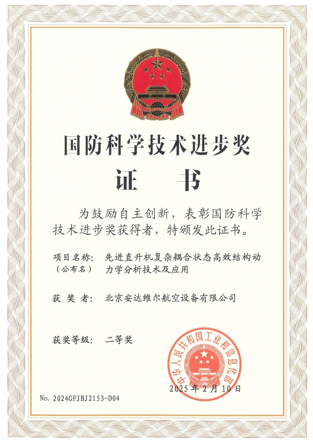 近日,北京安达维尔航空设备有限公司(下称“航空设备公司”)参与完成的“先进直升机复杂耦合状态高效结构动力学分析技术及应用”项目,凭借其突出的创新性、先进的技术水平和显著的综合效益,荣获2025年国防科学技术进步奖二等奖。