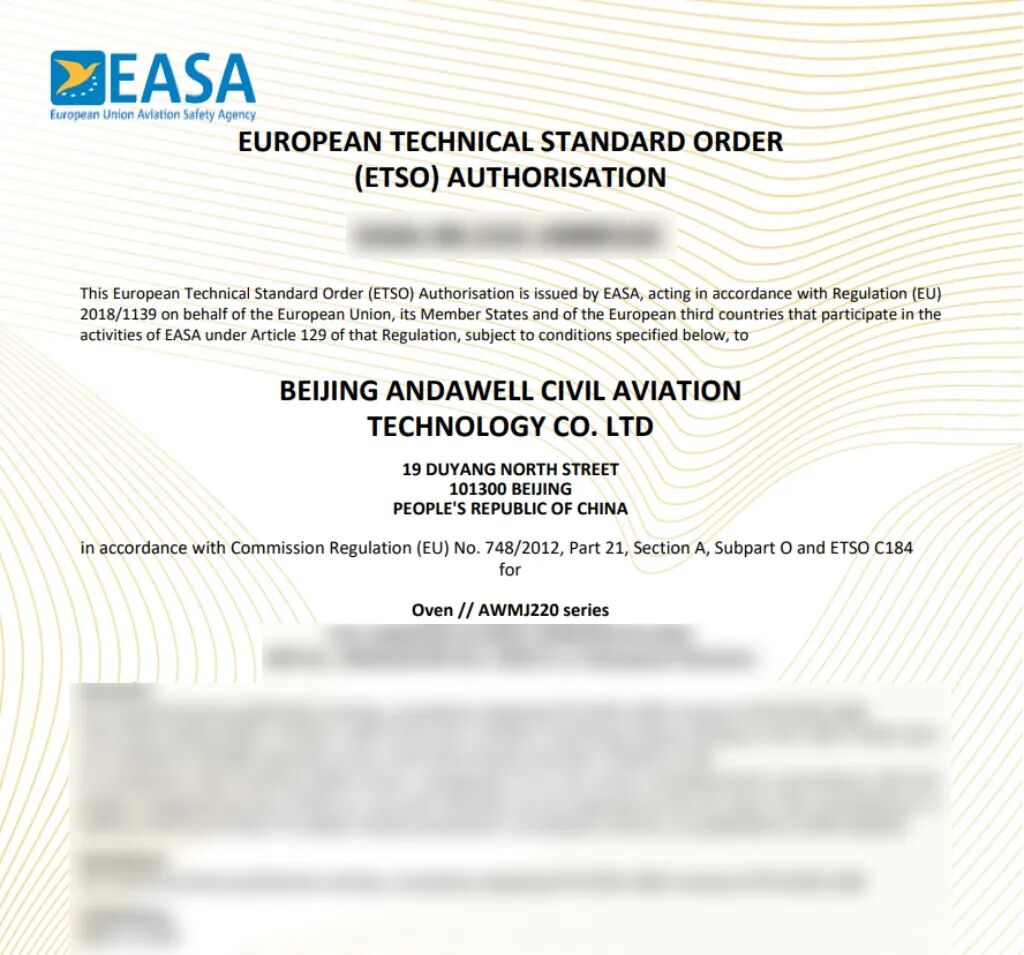 近日,北京安达维尔科技股份有限公司全资子公司北京安达维尔民用航空技术有限公司(以下简称“民航技术公司”)自主研制的“羽享”系列飞机厨房插件产品,正式获得欧洲航空安全局(以下简称“EASA”)颁发的欧洲技术标准规定批准书(以下简称“ETSOA”)。
