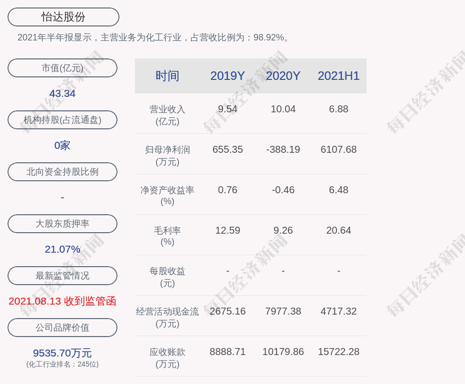 2021年半年报显示,怡达股份的主营业务为化工行业。