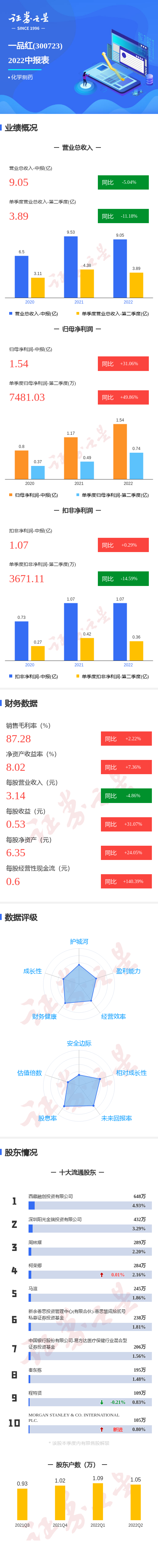 一品红2022中报显示,公司主营收入9.05亿元,同比下降5.04%;归母净利润1.55亿元,同比上升31.06%;扣非净利润1.08亿元,同比上升0.29%;其中2022年第二季度,公司单季度主营收入3.89亿元,同比下降11.18%;单季度归母净利润7481.03万元,同比上升49.86%;单季度扣非净利润3671.11万元,同比下降14.59%;负债率49.47%,投资收益-983.0万元,财务费用474.81万元,毛利率87.28%。
