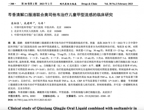 那么在临床上,有哪些药物可以与奥司他韦联合使用吗?以《芩香清解口服液联合奥司他韦治疗儿童甲型流感的临床研究》为例,临床研究显示:芩香清解口服液联合奥司他韦治疗甲型流感的退热效果显著,能有效减轻患儿相关症状、控制病毒感染,并可进一步抑制机体炎症反应,且安全性好,值得临床推广应用。