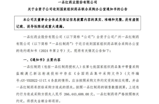 据测算,一品红制药的违约行为给采购方造成了约2.66亿元的损失。一品红制药将按照约定,全额退回该损失金额。