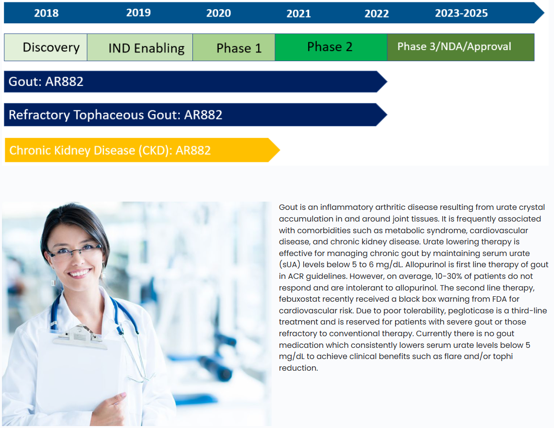 据披露,AR882胶囊是一种高效选择性的新一代尿酸转运蛋白(URAT1)抑制剂,通过抑制对尿酸重吸收使尿液尿酸盐排泄正常化,从而降低血清尿酸(sUA)水平,用于痛风治疗。