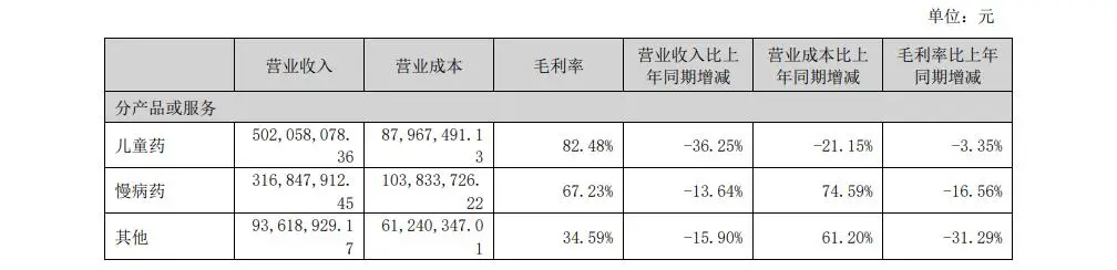 2024年半年报显示,一品红儿童药、慢病药等核心业务营收和毛利率均不同程度下滑。其中,儿童药收入同比下滑36.25%,慢病药收入同比下滑13.64%。儿童药、慢病药的毛利率比上年同期分别下降3.35%、16.56%。