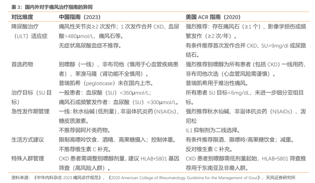 在痛风治疗领域,中国指南侧重分层用药,美国指南强化难治性治疗与心血管安全。如表3 所示,根据中华医学会风湿病学分会编制的《痛风诊疗规范》和美国风湿病学会(ACR)发布的痛风管理指南,二者均以降低血尿酸(SU)至 6mg/dL为核心目标,首选别嘌醇作为一线药物,急性期优先使用秋水仙碱、NSAIDs或糖皮质激素,并强调降尿酸治疗(ULT)起始时联用抗炎药物预防痛风急性发作。主要差异在于:中国指南针对痛风石或频繁发作的患者者设定更低SU目标( 5mg/dL),并纳入降尿酸药物苯溴马隆;而ACR指南明确推荐普瑞凯希用于治疗难治性痛风,且针对非布司他在心血管疾病患者中的使用限制更加严格。