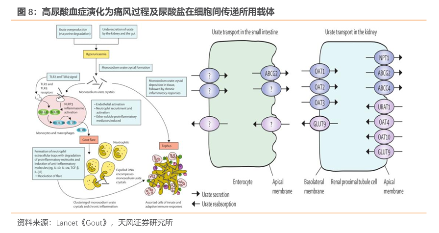 痛风:与高尿酸血症直接相关的晶体沉积性疾病。痛风是一种常见且可治疗的疾病,病因为单钠尿酸盐晶体在关节和非关节结构中的沉积。血清尿酸浓度增高(高尿酸血症)是发展痛风最重要的风险因素,通常当血清尿酸盐高于或等于0.42mmol/L(7mg/dL)时,我们认为患有高尿酸血症。血清尿酸由肾脏和肠道中的尿酸转运蛋白调节,特别是GLUT9(SLC2A9)、URAT1(SLC22A12)和ABCG2 蛋白。单钠尿酸盐晶体通过激活NLRP3炎症小体并释放IL-1β,从而引起炎症。研究表明长期降低尿酸治疗(例如,别嘌呤醇)会导致单钠尿酸盐晶体溶解,最终预防痛风发作和痛风石,并改善生活质量。此外提供高质量的痛风护理也是有效的。