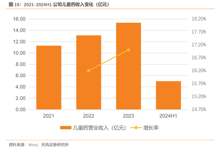 2021-2023 年儿童药业务营业收入增长稳健,2023年,公司儿童药领域实现15.36亿元的营业收入,同比增长17.01%。2024上半年公司儿童药收入约5.02亿元,同比减少36.25%。而未来在国家大力扶持儿童药发展的背景下,儿童药物市场有望迎来新一轮快速增长。2024 年1月,国家卫健委联合多部门发布《关于推进儿童医疗卫生服务高质量发展的意见》,力争到2025年,完善功能明确、布局合理、规模适当、富有效率的国家、区域、省、市、县级儿童医疗卫生服务体系。到2035年,基本形成城乡均衡、协同高效的儿童医疗卫生服务体系,更好满足儿童医疗卫生服务需求。2024年5月,国家卫生健康委等部门发布了《第五批鼓励研发申报儿童药品建议清单》。