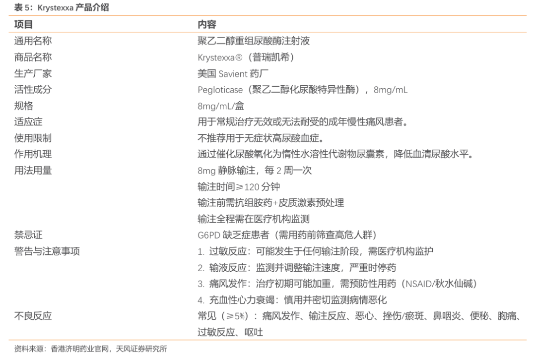难治性慢性痛风药物市场空间广阔。近年来获批上市的痛风新药主要有以下几款:安进的Krystexxa、日本卫材的多替诺雷等。其中,安进的Krystexxa(通用名:普瑞凯希)于2010年在美国获批上市,根据安进公司2023年年报显示,Krystexxa是难治性慢性痛风的唯一生物制剂,2023年Krystexxa销售额为2.72亿美元,2024年为11.85亿美元,2024年销售同比增长336%。但因其高过敏风险92%患者易产生抗药性,目前未在中国大陆获批。