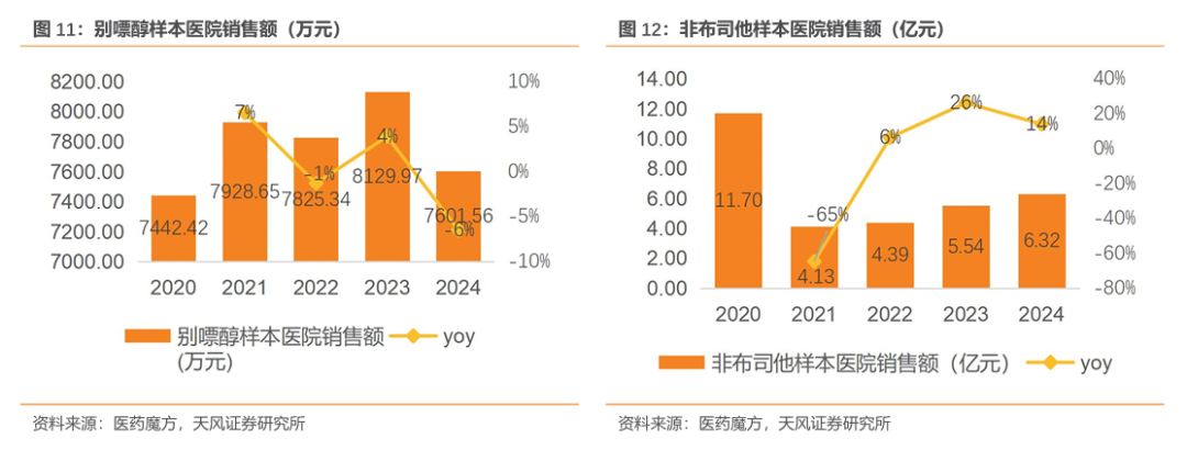 现有XO抑制剂主要包括别嘌醇和非布司他等。别嘌醇作为经典的XO抑制剂代表药物,别嘌醇本身也可被黄嘌呤氧化酶催化生成别黄嘌呤,后者也有抑制黄嘌呤氧化酶的作用。别嘌醇最早于1966年获得美国FDA批准上市,在国内已被纳入医保甲类目录,2024年别嘌醇中国样本医院销售额为7601.56万元。非布司他由日本帝人(Teijin)株式会社研发,在欧盟、美国、日本已获批上市,2018年9月在中国获批上市,非布司他纳入了第三批国家药品带量采购,2024年非布司他中国样本医院销售额为6.32亿元。