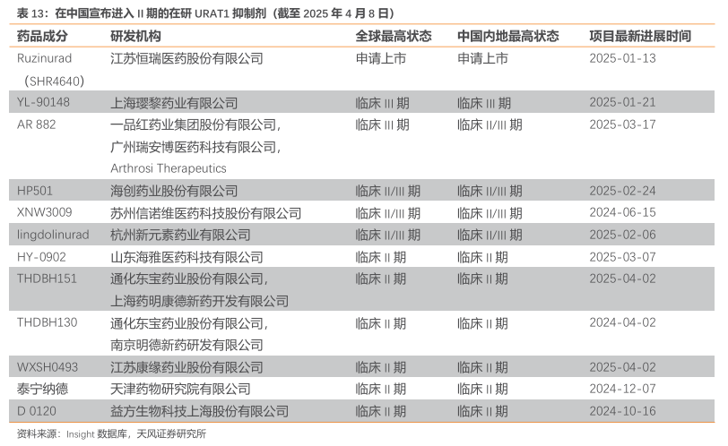 URAT1 靶点药物或将成为治疗热点。全球范围内超过30个在研项目密集布局,覆盖从临床前到上市全链条:持田制药的多替诺雷(已上市)和恒瑞医药的Ruzinurad(申请上市)领跑第一梯队;一品红(AR882)、江泰制药(Epaminurad)及上海璎黎(YL-90148)等处于临床III期;海创药业(HP501)通过拓展慢性肾脏病等并发症构建差异化优势,而辉瑞、阿斯利康等跨国药企与东阳光等国内药企则通过多靶点联用(如URAT1/XO)争夺技术高地。
