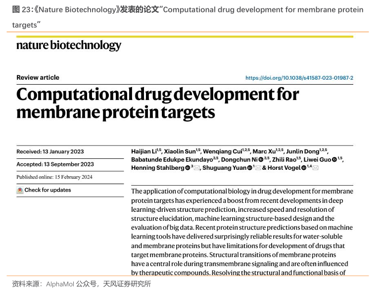 2024 年2月15日,阿尔法分子牵手洛桑瑞士联邦理工学院(EFPL)、中科院深圳先进技术研究院,共同在国际顶级期刊《Nature Biotechnology》发表分析与综述性论文“Computational drug development for membrane protein targets”。传统的针对包括GPCR 在内的膜蛋白的新药研发策略存在诸多短板,本论文为基于GPCR等膜蛋白靶点的新药研发提供了新思路和方向。