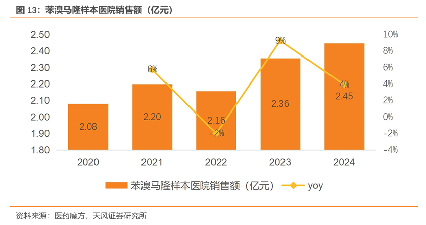URAT1 抑制剂主要有上市已久的苯溴马隆、日本卫材的多替诺雷等。URAT1抑制剂主要有上市已久的苯溴马隆和近期上市的多替诺雷。苯溴马隆可同时抑制URAT1和GLUT9,抑制肾小管尿酸重吸收,增加尿酸排泄,降低血尿酸水平。自2003年国际上报道该药导致严重肝毒性后,苯溴马隆陆续在一些国家撤市,目前苯溴马隆在日本、新加坡和中国等一些亚洲国家使用。在国内苯溴马隆被纳入国家医保乙类目录,2024年苯溴马隆中国样本医院销售额为2.45亿元。多替诺雷由日本卫材注册申请,于2024年12月获NMPA批准在中国上市。