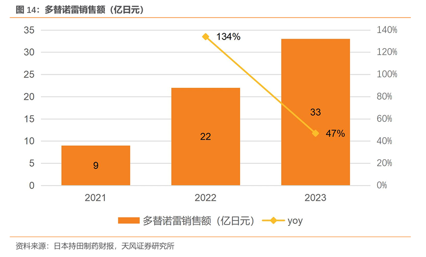 多替诺雷(Dotinurad、URECE,商品名:优乐思?)是富士雅库兴发现的一种治疗痛风和高尿酸血症的治疗药物,该产品于2020年1月在日本获批上市,并于2024年12月由卫材注册申请,在中国获批上市。多替诺雷选择性地抑制尿酸转运体之一URAT1,从而防止肾脏对尿酸的再吸收,促进尿酸在尿液中的排泄。此外,多替诺雷对其他影响尿酸分泌的转运体的影响较小,因此在较低剂量时可降低血清尿酸水平。多替诺雷在2021年全年销售额9亿日元,2022年全年销售额22亿日元,同比增速134%;2023年实现全年销售额33 亿日元,同比增速47%。