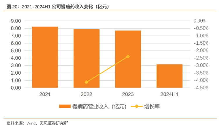 2021-2023 年,公司慢病药收入持续降低,2023年慢病药全年营收7.70亿元,同比降低2.04%。2024 上半年,公司慢病药产品收入3.17亿元,同比降低13.64%。