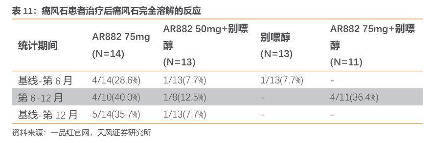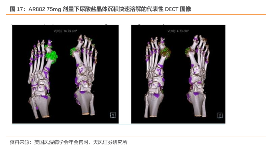 AR882 75mg单独使用或与别嘌醇联合使用显示,从基线到第6个月,总尿酸晶体体积减少;第6至12个月的拓展研究中,痛风晶体体积持续减少。